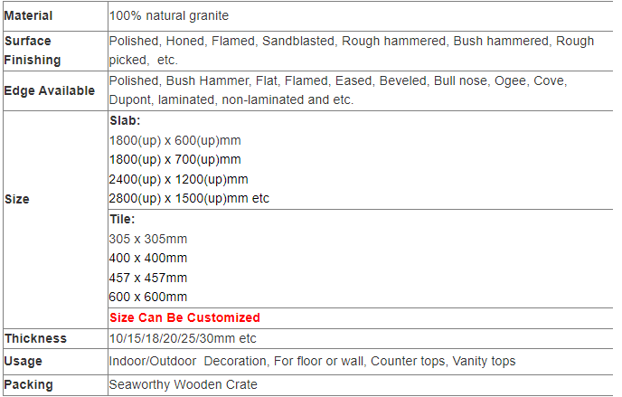 Polished, Honed, Flamed, Sandblasted, Rough hammered, Bush hammered, Rough picked, etc.
