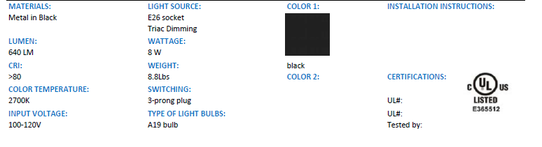 "LUMEN:640 LM,COLOR TEMPERATURE:2700K,INPUT VOLTAGE:100-120V,LIGHT SOURCE:E26 socket
