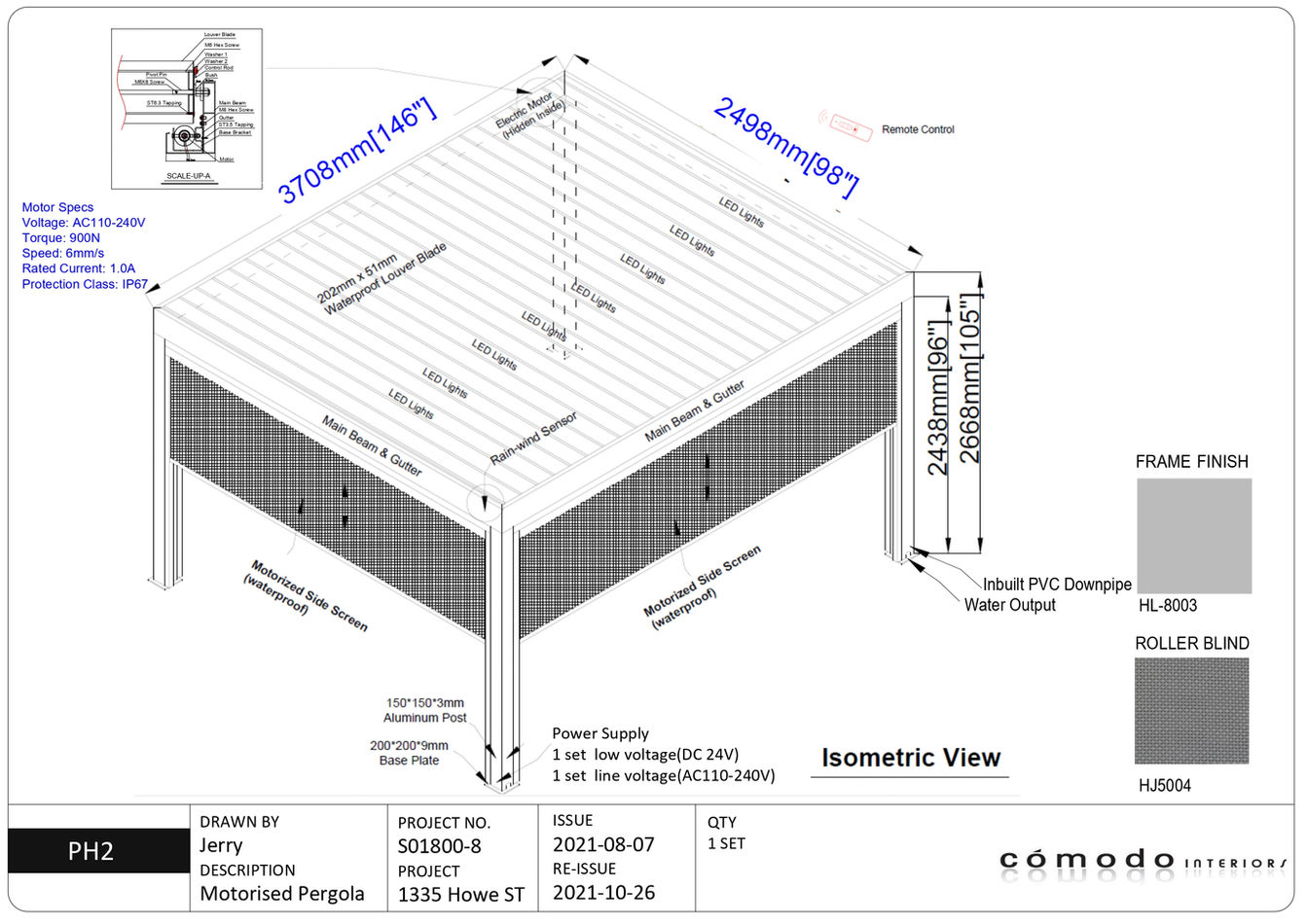 Motorized Pergolas For 1335 Howe St., Vancouver, Including Rain/Sun Sensors, Led Lighting, Motorized Side Screens, And An Aluminum Base.