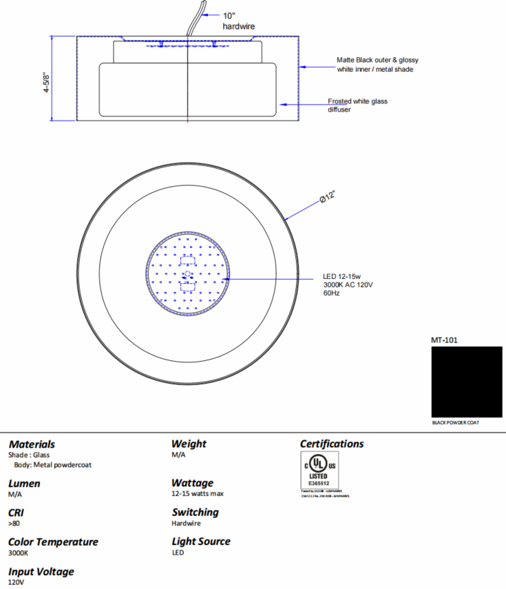 Lumen, M/A, Color Temperature ,3000K, Input Voltage ,120V, Wattage,12-15 Watts Max, Light Source, LED